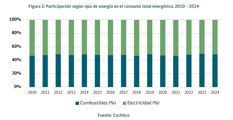 Share of electricity and heat in total energy consumption, 2010–2024. Source: Cochilco